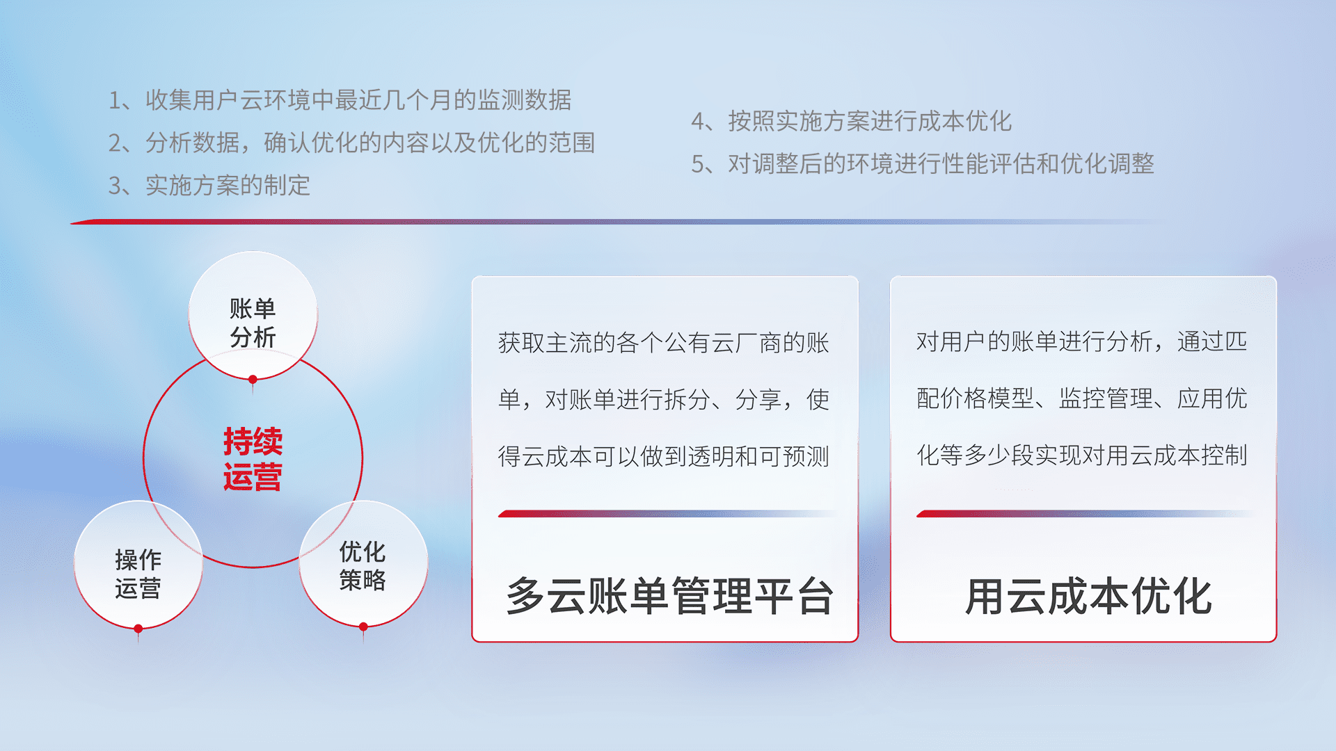 通过多云纳管,,,以统一的资源数据模型把客户的云资源进行抽象和封装,,,进而实现对多云资源的统一操作,,保障云资源管理的可靠性、、、稳定性与可用性。。。量身定制化运维内容,,配置、、、开发运维、、、补丁管理、、、、备份、、、监控、、、认证和访问管理、、审计和日常巡检等,,保障在用云过程中的可靠度,,,,稳定度以及高可用率。。